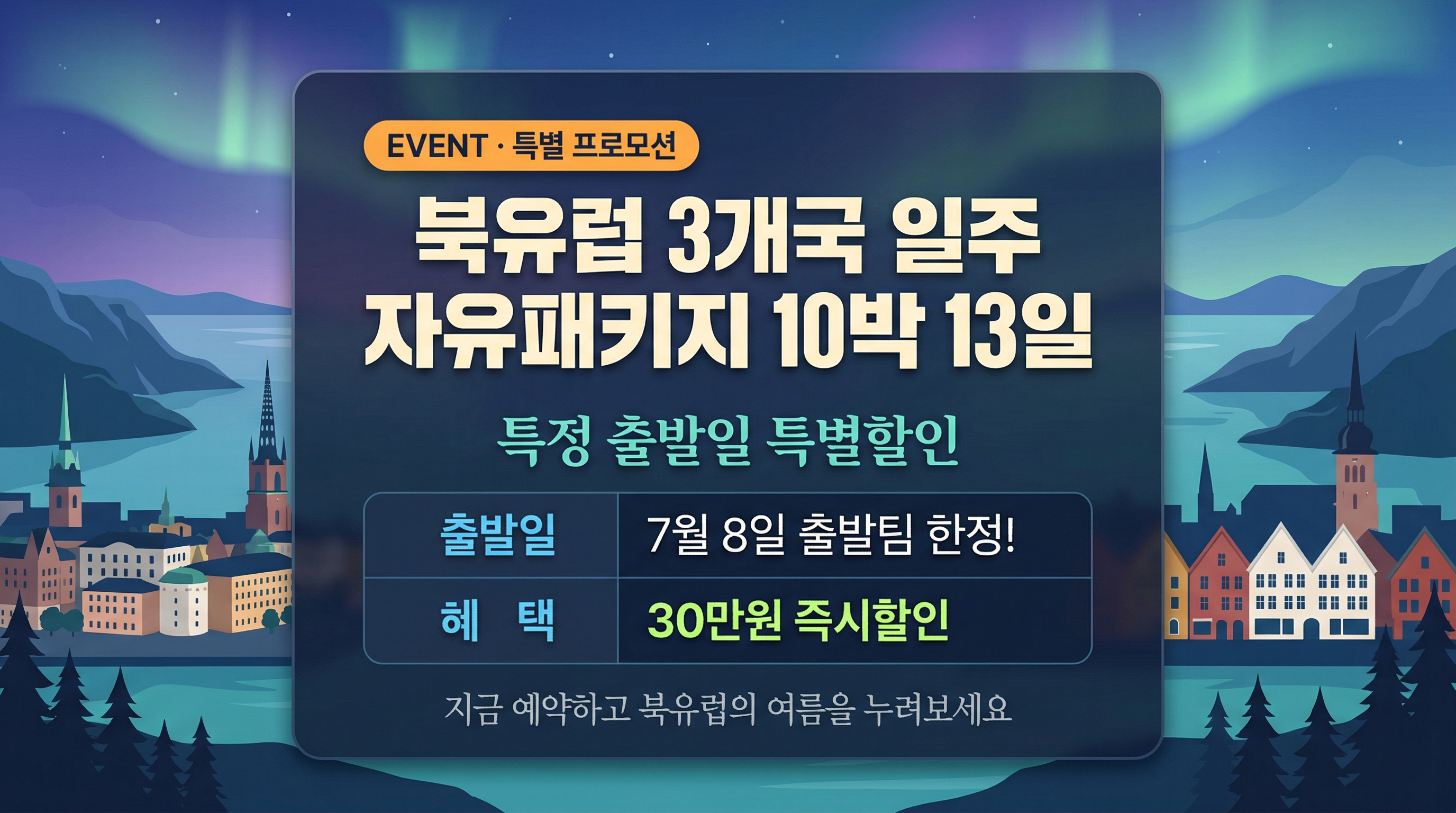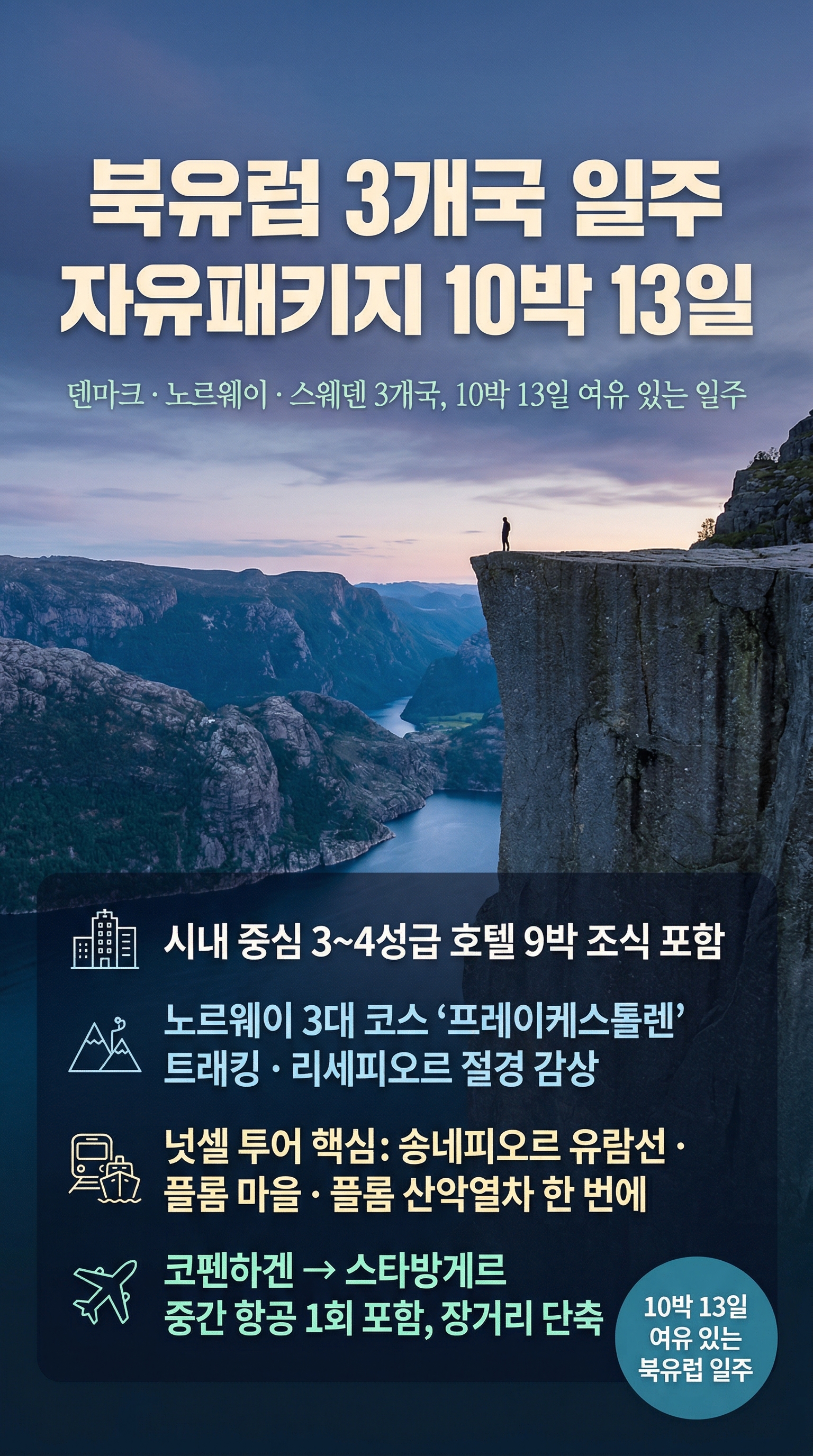 덴마크·노르웨이·스웨덴 3개국을 10박 13일 동안 여유 있게 일주하며 시내 중심 3~4성급 호텔 9박(조식 포함)에서 편안한 휴식을 즐길 수 있습니다.