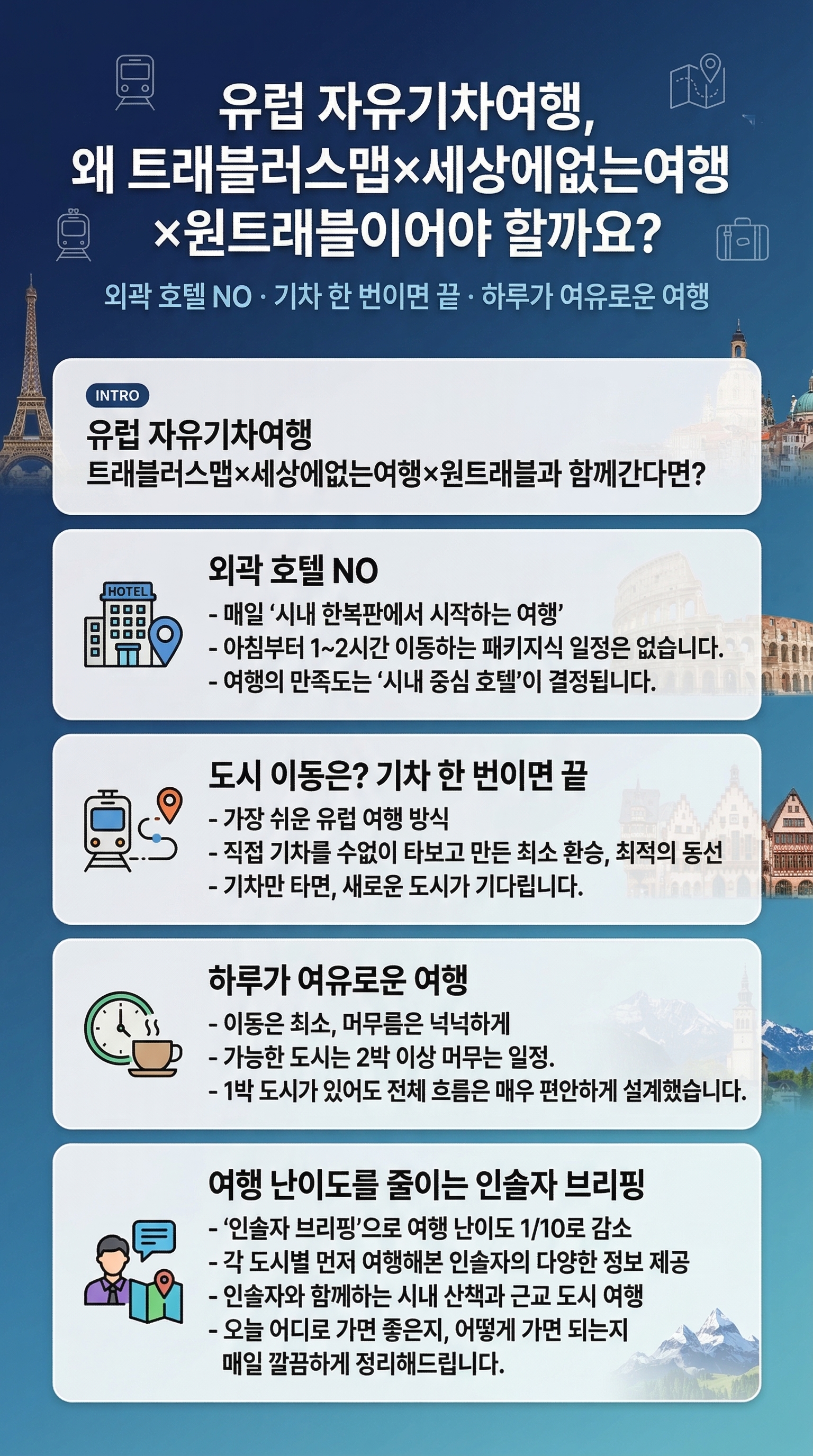 시내 중심 3~4성급 호텔 10박(조식 포함, 2인 1실)과 도시별 2~3박 연박 구성으로 매일 한복판에서 여유롭게 시작하세요.
