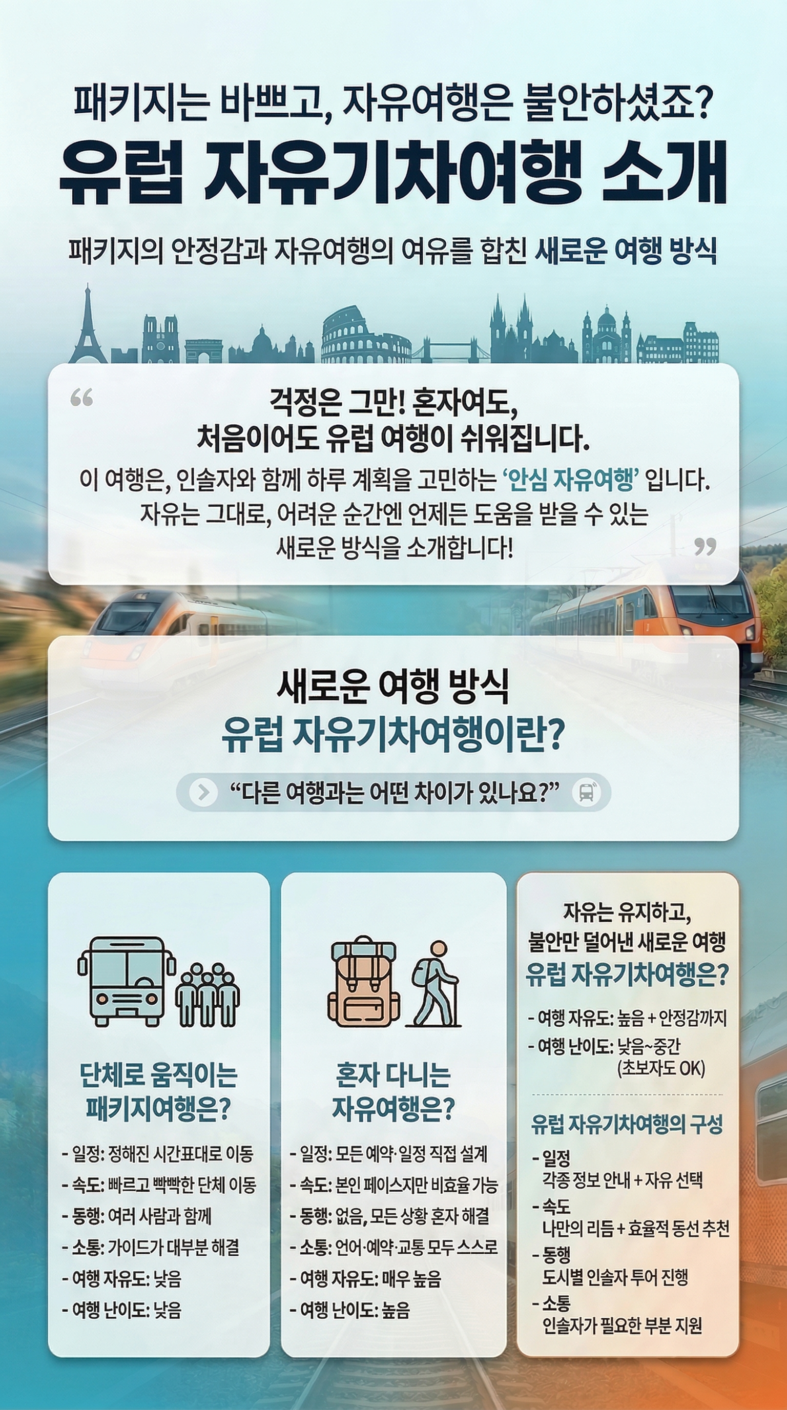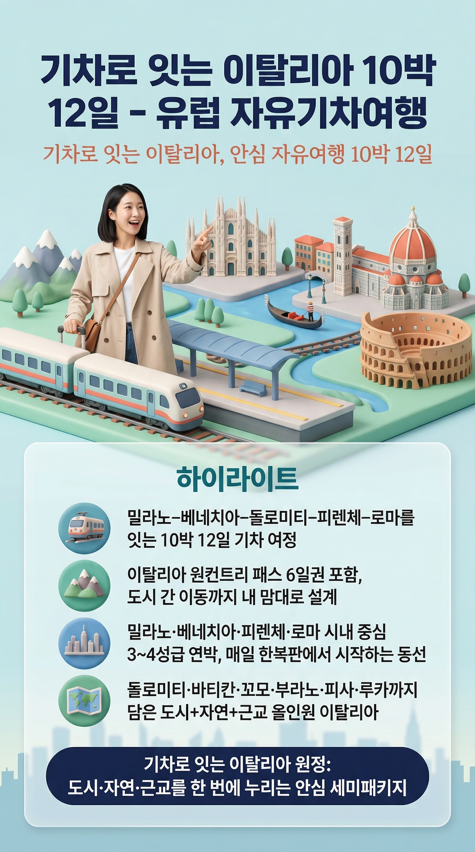 전 일정 한국인 유럽 전문 인솔자 동행으로 밀라노→베네치아→돌로미티→피렌체→로마까지 10박 12일 안심 자유여행을 떠나세요.