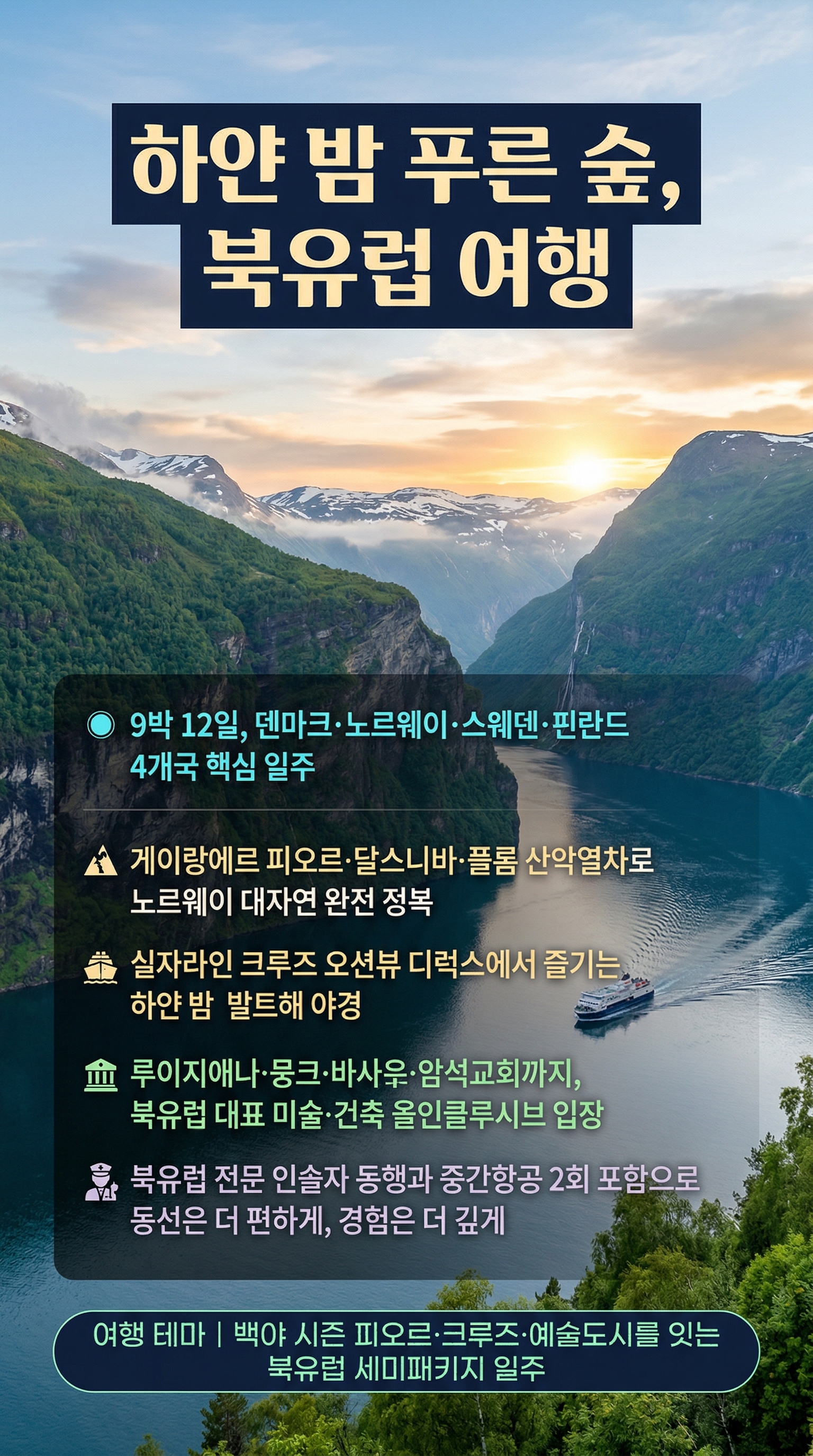 9박 12일 동안 덴마크·노르웨이·스웨덴·핀란드 4개국 핵심 일주로 코펜하겐→오슬로→게이랑에르→플롬→베르겐→스톡홀름→헬싱키를 한 번에 경험하세요.